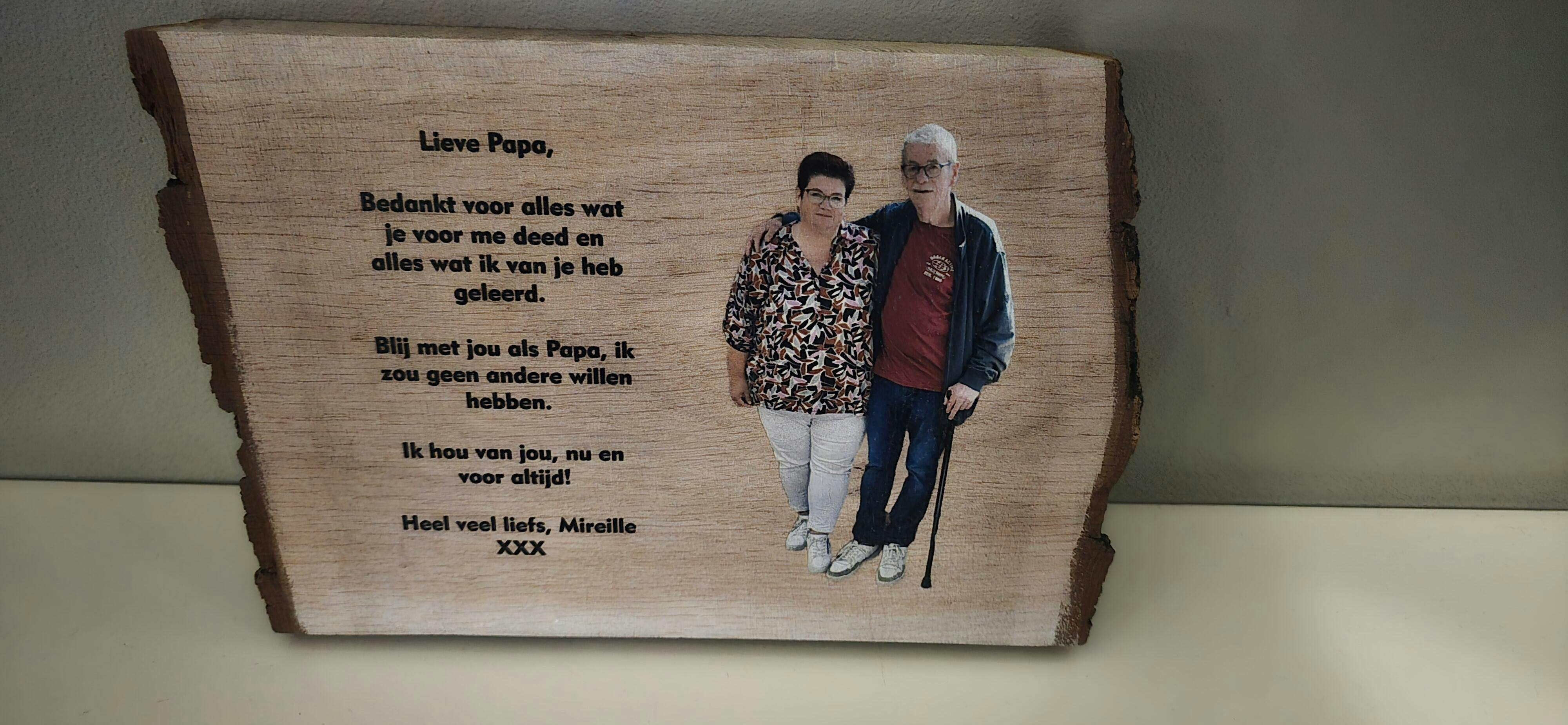 Voor ons houten huwelijk dit prachtige kunstwerk laten maken. Er is goed geluisterd naar de wens die ik had doorgegeven mbt de foto. Het is precies geworden wat ik hoopte. Heel erg bedankt.