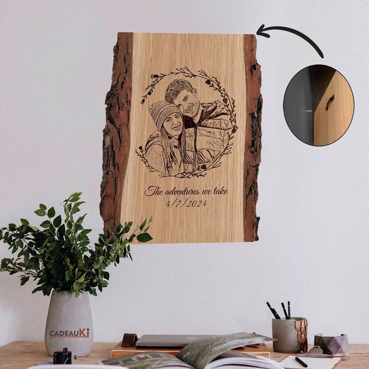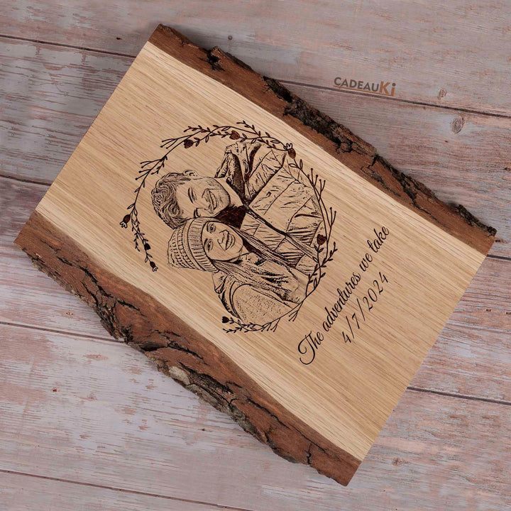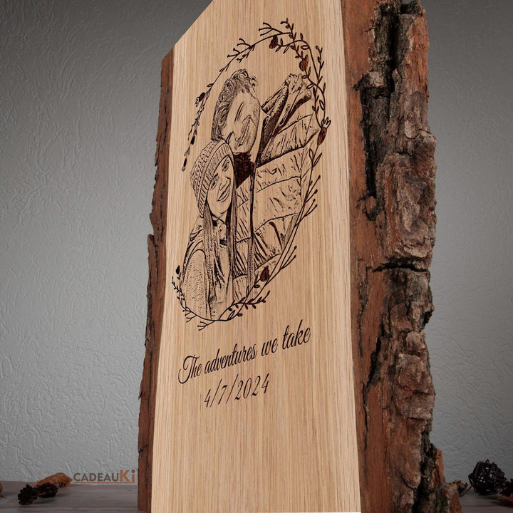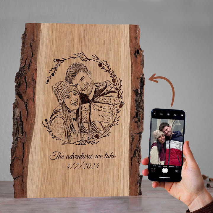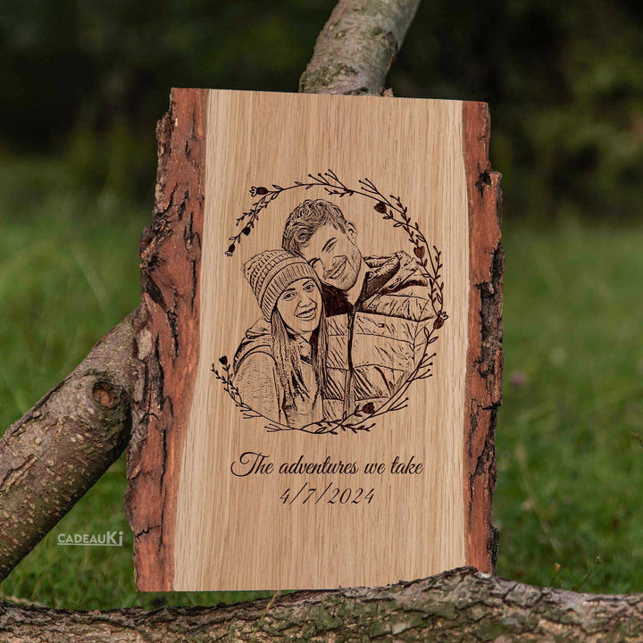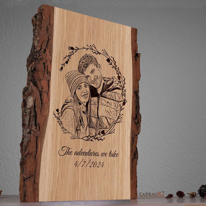 Met de delicate bloemdecoraties die jouw afbeelding omringen, krijgt elk portret op hout met schors een elegante en tijdloze uitstraling. Laat ons jouw dierbare herinneringen omzetten in een kunstwerk dat spreekt van liefde en nostalgie. Kies voor een creatief en blijvend huwelijkscadeau, een uniek cadeau voor hem, of een origineel cadeau voor elke mijlpaal.
