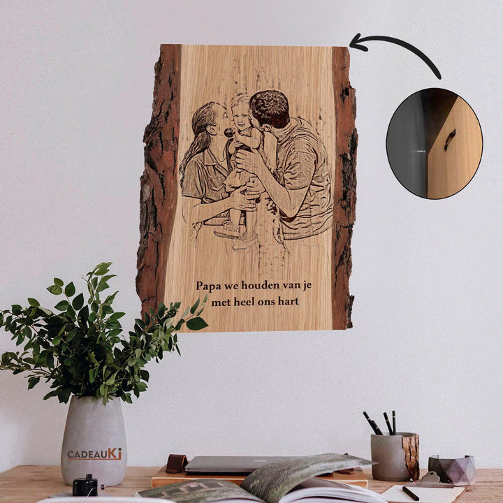 De natuurlijke schors die elk van onze houtstukken omringt, geeft je foto een authentieke look. Deze unieke touch voegt een charmante natuurlijkheid toe aan elke ruimte.