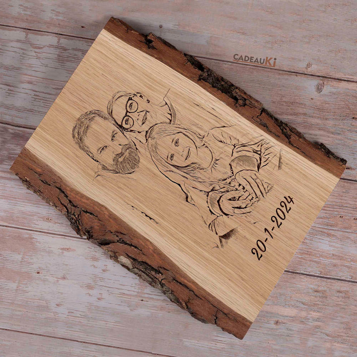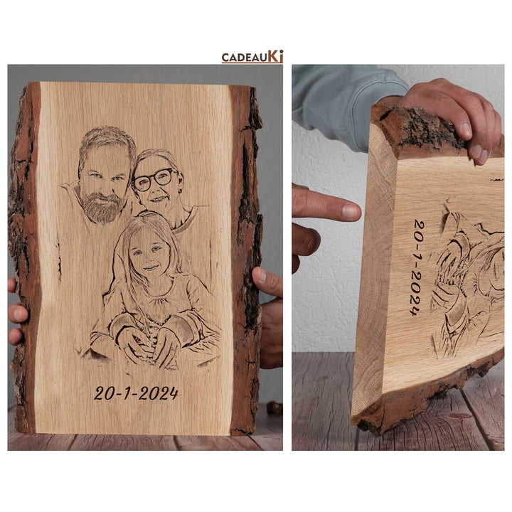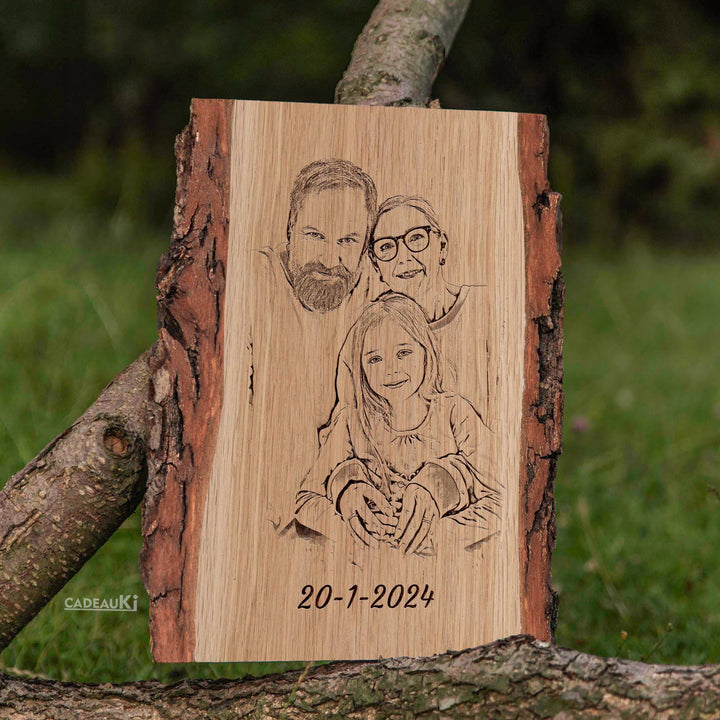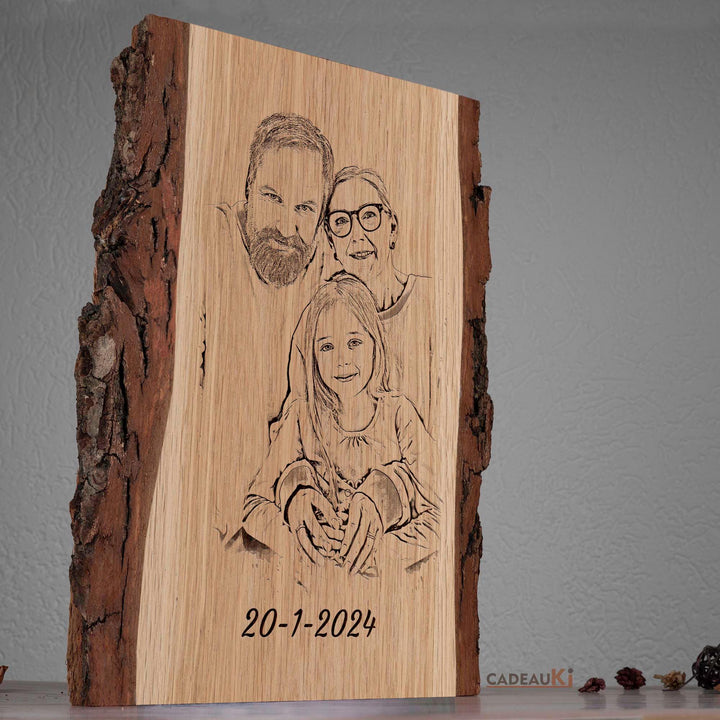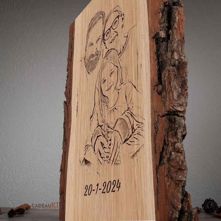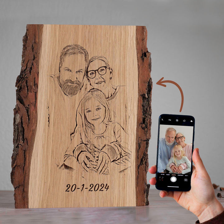 Het kunstwerk wordt gemaakt met een nauwkeurig proces waarbij de afbeelding eerst wordt getekend en vervolgens zorgvuldig op het hout wordt gebrand. Deze techniek, bekend als houtbranden of pyrografie, zorgt ervoor dat elk detail niet alleen zichtbaar maar ook tastbaar is. Je kunt uitkijken naar het voelen van de groeven en texturen die door het brandproces zijn gecreëerd, wat een unieke zintuiglijke dimensie aan het stuk toevoegt die het echt onderscheidt. Of het nu een decoratie is voor de woonkamer, slaapkamer, of een andere ruimte in huis, dit hout personaliseren met pyrografie hout techniek biedt een authentieke charme en warmte aan je interieur. Het hout met schors is niet alleen een mooi foto cadeau maar ook een prachtige manier om herinneringen op een unieke manier vast te leggen, het is zowel een blijvende herinnering als cadeau.