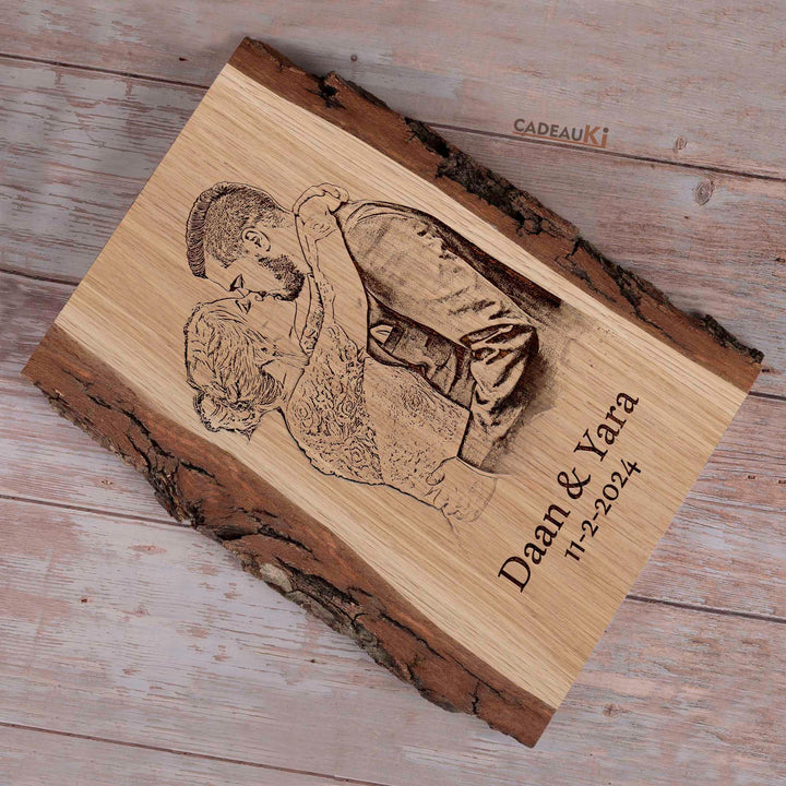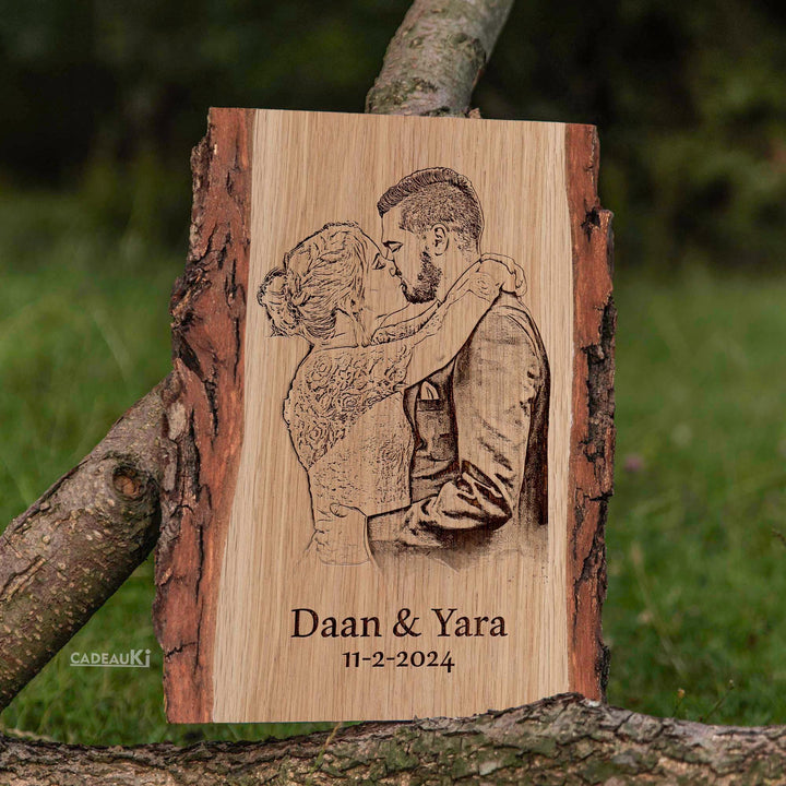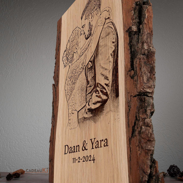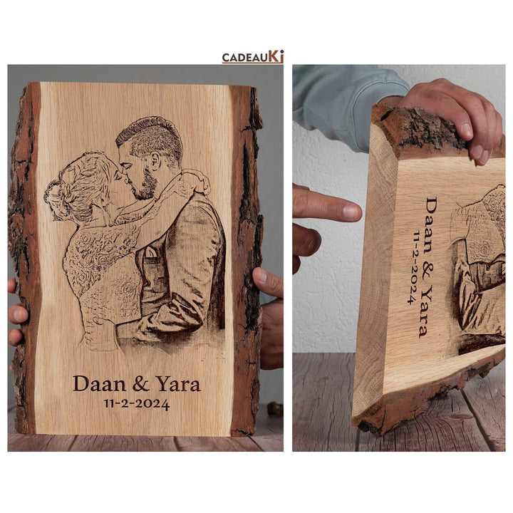 Stel je voor: een prachtig portret op hout, zorgvuldig met de hand getekend en gebrand, dat de essentie van jouw dierbare momenten vangt. Van de eerste kus tot een onvergetelijke vakantie, elk detail van jouw foto wordt tot leven gebracht op een houten plank met natuurlijke schors. Dit 100% handgemaakte proces, bekend als pyrografie, zorgt ervoor dat geen twee stukken precies hetzelfde zijn, wat jouw cadeau écht uniek maakt. Dit is niet zomaar een cadeau; het is een blijvend aandenken dat met liefde en zorg is gemaakt.