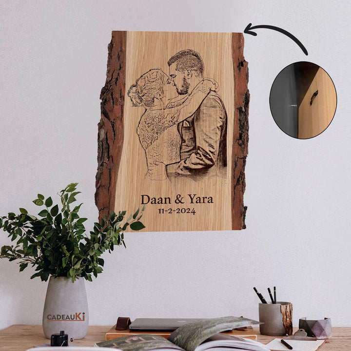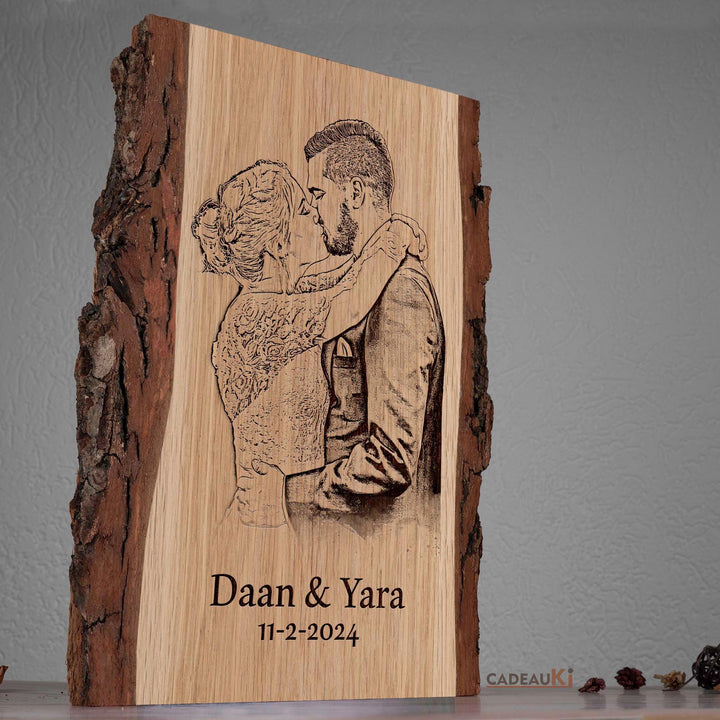 Op zoek naar dat ene speciale cadeau dat zowel uniek als persoonlijk is? Zoek dan niet verder! Ons gepersonaliseerde fotocadeau op hout met schors brengt jouw mooiste herinneringen tot leven met de kunst van pyrografie. Of het nu gaat om een viering van liefde, een huwelijksjubileum, of een housewarming, deze houten kunstwerken zijn een hartverwarmend cadeau voor elke gelegenheid.