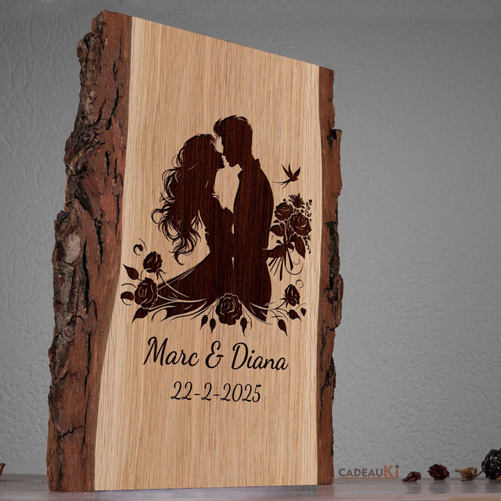 Leg jullie liefde vast in hout met dit romantische silhouet van een koppel, omgeven door bloemen en een warme sfeer.